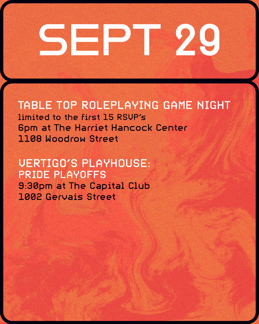 Have an event or gathering you'd like added to the official pride week calendar? Tell us about it and we'll be in touch!