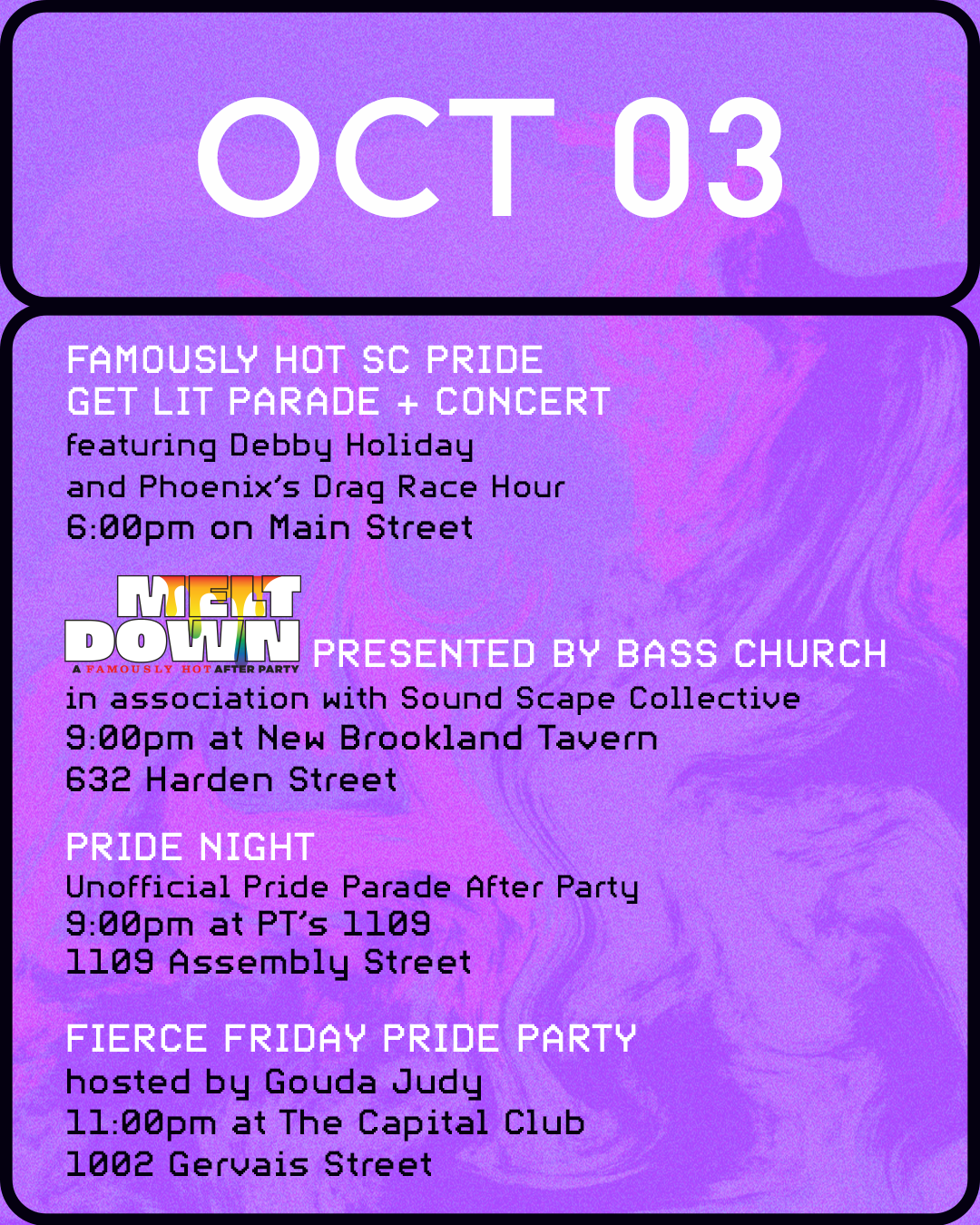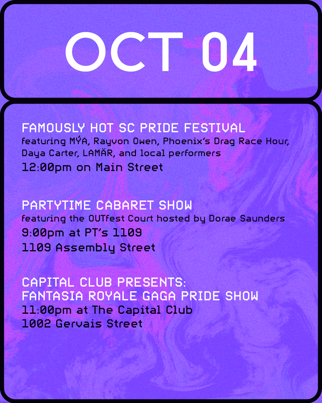 FAMOUSLY HOT SC PRIDE FESTIVAL featuring MYA, Rayvon Owen, Phoenix’s Drag Race Hour, Daya Carter, LAMAR, and local performers